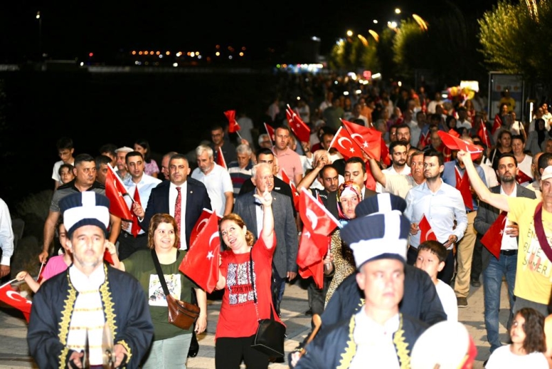 15 Temmuz Şehitler Meydanında toplanan vatandaşlarımız İlçe Kaymakamımız Emre Öztürk, Belediye Başkanımız Eyüp Yılmaz önderliğinde 15 Temmuz Şehitler parkına yürüdü. Mehteran takımı eşliğinde gerçekleşen kortejde ellerinde Türk bayraklarıyla katılan vatandaşlarımız demokrasi nöbetine sahip çıktı. Bir dakikalık saygı duruşu akabinde istiklal marşının okunmasıyla başlayan programda şiirler, kuranı kerim tilaveti, ilahiler seslendirildi. Cumhurbaşkanı Recep Tayyip Erdoğan'ın konuşmasının yayınlanmasının ardından Belediye Başkanımız Eyüp Yılmaz hemşerilerine hitap ederek demokrasiye sahip çıkılması çağrısı yaptı. Tiyatro gösterisinin sahne aldığı gecede Abdülkadir Katra ve ekibi 15 Temmuz temalı oyunu sergiledi. Başkanımız Eyüp Yılmaz sahneye çıkarak Katra Tiyatro Ekibi adına Abdülkadir Katra'ya hediye takdim etti. Okunan selaların ardından program sona erdi.