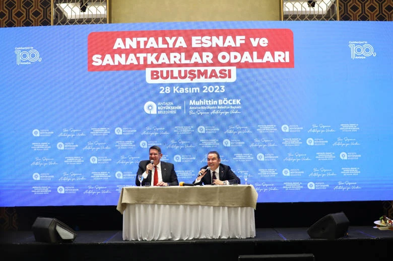 Antalya Büyükşehir Belediye Başkanı Muhittin Böcek, esnafın sorunlarını dinlemek ve birlikte çözüm bulmak için Antalya Esnaf ve Sanatkarlar Odaları Birliği'ne (AESOB) bağlı odaların başkanları ile buluştu. 75 oda başkanı ve belediye bürokratlarının katıldığı toplantıda talep ve önerileri dinleyen Başkan Böcek, proje ve hizmetlerini anlattı. Başkan Böcek, su indirimi, ulaşım, tarım, turizm, altyapı yatırımları, Sobacılar Çarşısı, Doğu Garajı-Nekropol, Balbey projeleri, Suryapı, Güneş mahalleri kentsel dönüşümü, kültür sanat etkinlikleri ile bilgi verdi. Planlı, kurallı, kimlikli kent vizyonuyla çalışmalarına devam ettiğini belirten Başkan Böcek, "Tüm dünyayı sarsan pandemi, ekonomik kriz, Cumhuriyet tarihimizin en büyük Manavgat orman yangını, Kumluca-Finike sel afetleri, Türkiye'nin en büyük deprem felaketi gibi olumsuzlukları bahane etmeden tüm sıkıntıları dayanışmayla, esnafımızla birlikte aştık. Üreten, istihdam sağlayan, turizm ve tarımın başkenti olmamıza katkı koyan tüm esnafımıza teşekkür ediyorum" dedi.