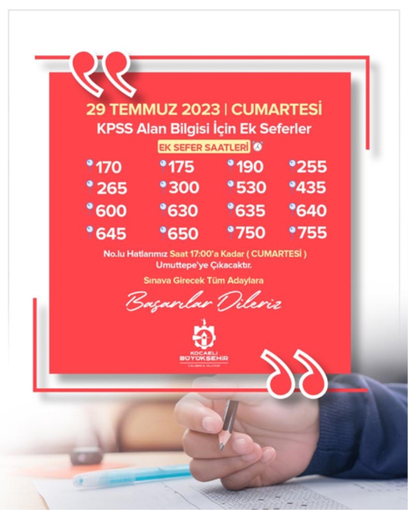 Kocaeli Büyükşehir Belediyesi, 29 Temmuz Cumartesi ve 30 Temmuz Pazar günü yapılacak Kamu Personeli Seçme Sınavı'na (KPSS) girecek adayların ulaşımda sorun yaşamaması için aynı gün ek seferler düzenleyecek. Bu kapsamda 170, 175, 190, 255, 265, 300, 435, 530, 600, 630, 635, 640, 645, 650, 750 ve 755 No'lu hatlar 2 gün ek sefer uygulanacak.