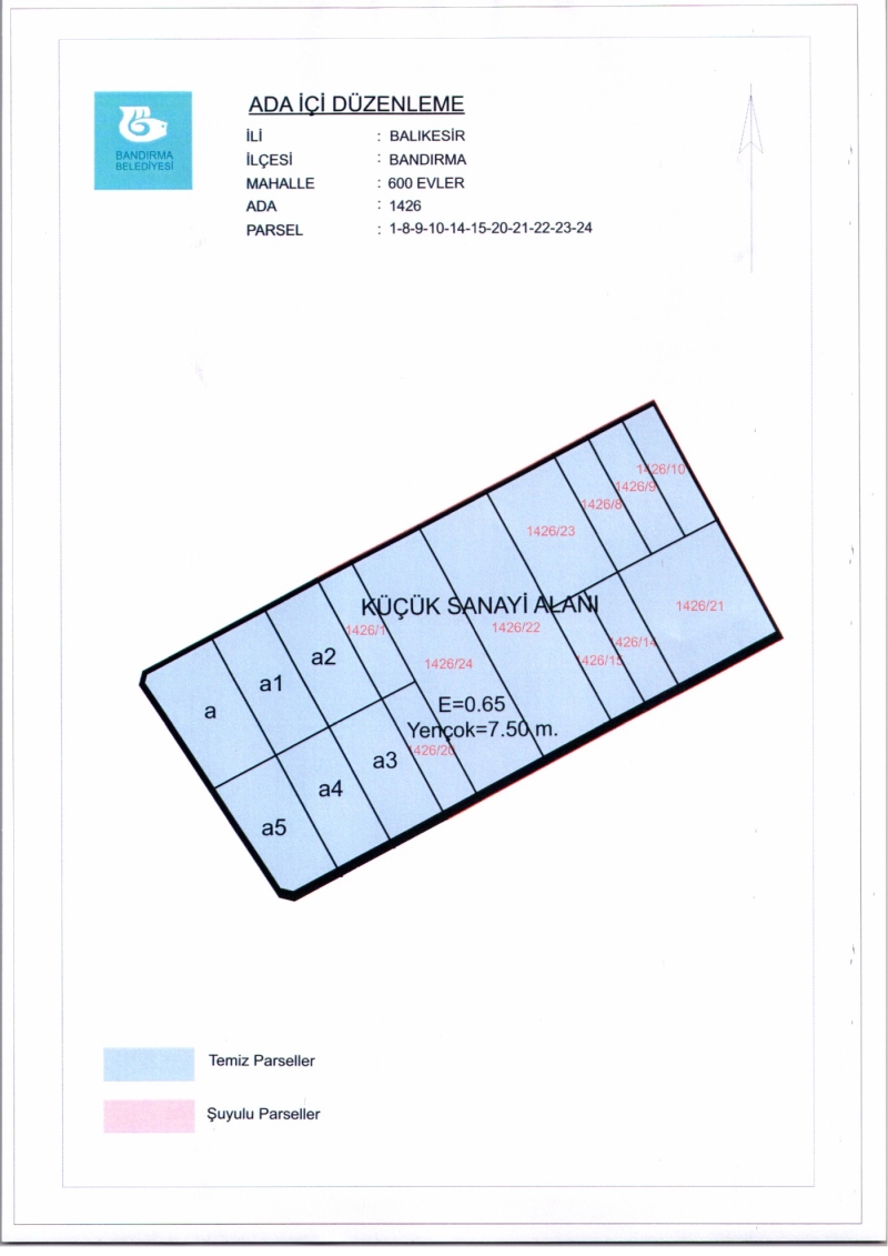 Belediye Encümeninin 26.07.2023 tarih ve 748 sayılı Encümen kararı ile 600 Evler Mahallesi 1426 ada 1-8-9-10-14-15-20-21-22-23-24 parsellere ait ada içi düzenlemesinin, 1/1000 ölçekli Bandırma Uygulama İmar Planı notlarının 137. Maddesi ve 3194 sayılı İmar Kanununun 19. maddesi gereği onaylanmasına,