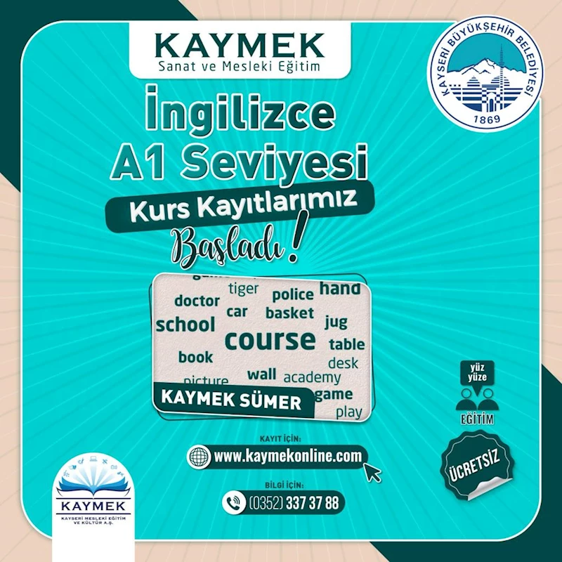KAYMEK Sümer Tesisi’nde Pazartesi, Çarşamba ve Cuma günleri 13.30-16.30 saatleri arasında düzenlenecek olan İngilizce A1 Seviye (2.Grup) kursuna kayıtlar www.kaymekonline.com internet adresi üzerinden yapılabilecek.