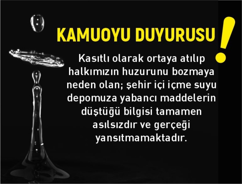 “Son günlerde ortaya atılan asılsız iddialarla şehir içi içme suyu şebekesinin salgın hastalıklara yol açtığı söylentisi yayılmıştır. Tamamen dezenformasyona dayalı, kasıtlı olarak ortaya atılıp halkımızın huzurunu bozmaya neden olan; şehir içi içme suyu depomuza yabancı maddelerin düştüğü bilgisi tamamen asılsızdır ve gerçeği yansıtmamaktadır. Son derece modern bir şekilde şehrimize su sağlayan depolarımıza her hangi bir varlığın düşmesi mümkün değildir. Bu gerçek olmayan haberler; çirkin ifadeler ve iftiralarla farklı bir boyuta taşınmış ve halkımız arasında rahatsızlıklara sebep olmuştur. Gerçeği yansıtmayan ve bir dayanağı olmayan söylentiler çirkin bir karalama kampanyasına dönüşmüştür.
