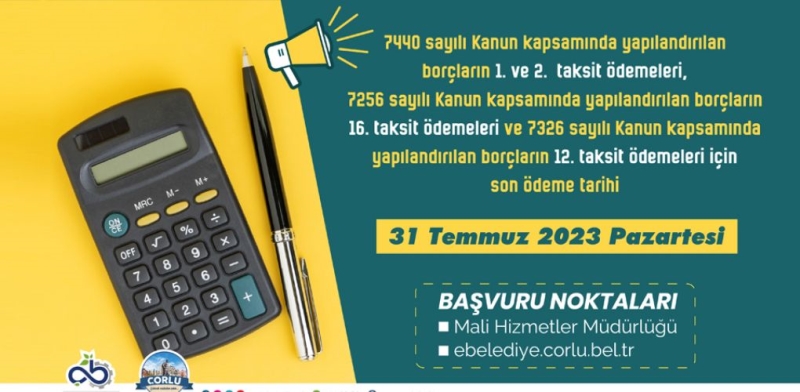 7440 sayılı Kanun kapsamında yapılandırılan borçların 1. ve 2. taksit ödemeleri, 7256 sayılı Kanun kapsamında yapılandırılan borçların 16. taksit ödemeleri ve 7326 sayılı Kanun kapsamında yapılandırılan borçların 12. taksit ödemeleri için son ödeme tarihi 31 Temmuz 2023 Pazartesi günüdür.